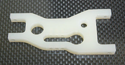 We are now making a replacement front A-arm for the Custom Works "Outlaw". The arm is made out of 6/6 white nylon and is dyeable. These arms are much stronger than stock. It is the same length as the current molded arm and has the 1/8 hinge pin holes. It also features three shock mounting holes for the shocks.