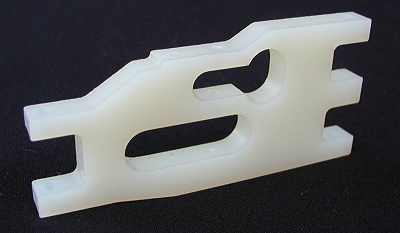 This is a replacemant A-arm for your Custom Works car. It is longer than your standard arm. The arms are usually used in the front for the Custom Works cars to help them turn, and they also stabilize the car. By putting two arms on your car it significantly widens your car but still keeps it within legal limits. The arms are machined out of .250 6/6 nylon sheet stock and are extremely strong. They come cream in color but are dyeable.